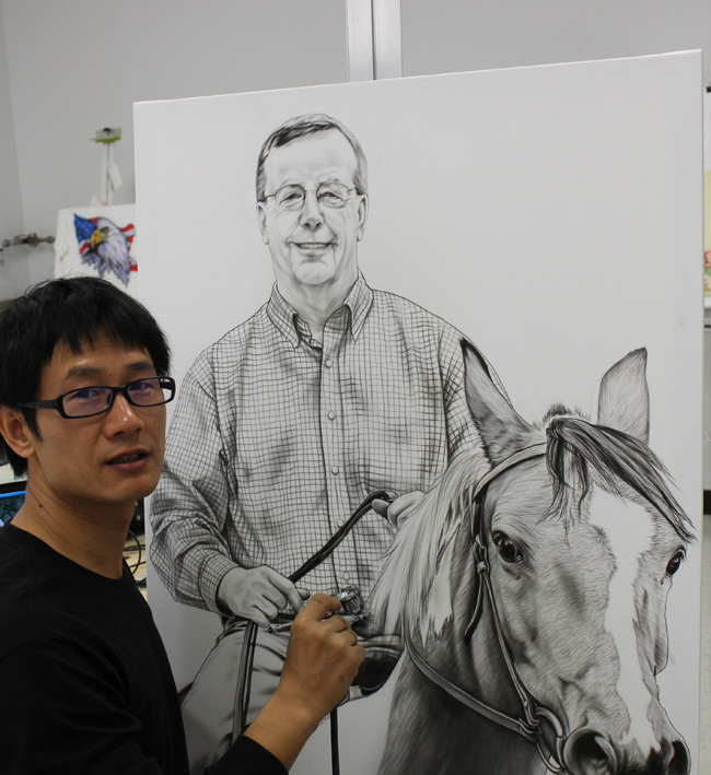Artist Dongbai Tang whose specialty is drawing realistic portraits painting, animal portraits painting, large murals painting, UV blacklightt paintings, airbrush car painting for past 26 years.He graduated from the University of Fine Arts majoring in oil painting .
